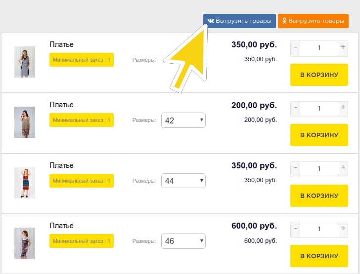 Вверху экрана – кнопки выгрузки товаров в социальные сети